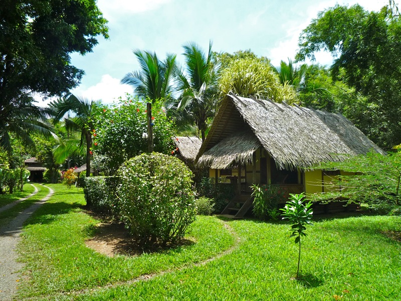 En Cahuita centro, junto al Parque Nacional. Bonitos jardines bien mantenidos. Trato personalizado.